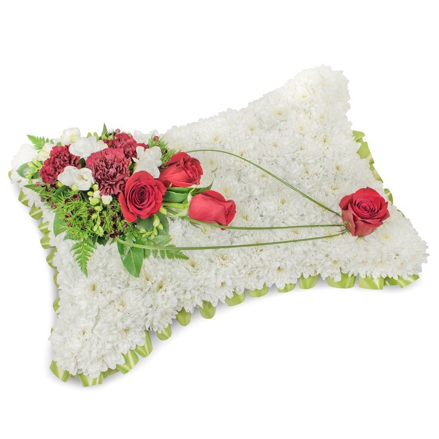 Express your deepest sympathies with our graceful bouquet, thoughtfully assembled with white chrysanthemums, red roses, white freesias, dark red carnations, dianthus, and bear grass. This elegant selection is perfect for conveying your heartfelt condolences.